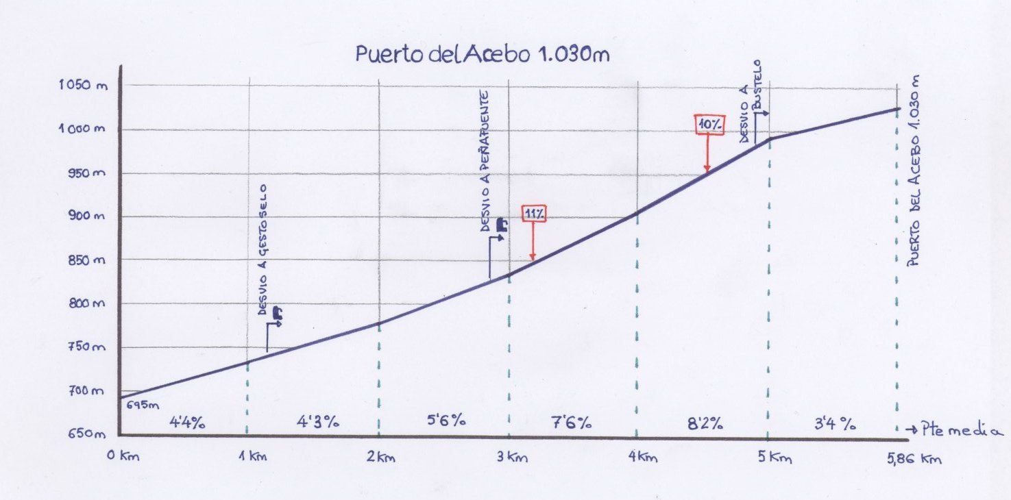 La primeras rampas son suaves entorno al 5% hasta que nos vamos adentrando en el pueblo de Peñafuente donde se encuentra un tramo al 11% de pendiente que enseguida se va suavizando. A escasos kilómetros de Peñafuente el puerto se va abriendo dejándonos ver el parque eólico situado en Piedras Apañadas y justo debajo avistamos el pequeño pueblo de Bustelo del Camino, justo al paso al lado de dicho pueblo la carretera nos brinda con una rampa del 10%. Ya lo tenemos conseguido después de este repecho nos espera un falso llano en los últimos metros antes de coronar el Puerto del Acebo a una altitud de 1.030 m.