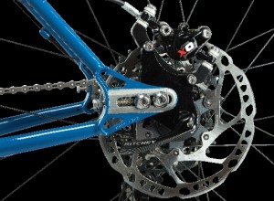 En el triangulo trasero los tubos de vainas y tirantes dibujan una ligera S a la altura de la rueda para facilitar el paso de la misma en condiciones de barro. Estos tubos se unen en unas peculiares punteras desmontables tanto para el cambio como para el freno de disco cuya particularidad reside en que las podemos desplazar hacia delante o detrás mediante unos tornillo Allen de 6 mm, deforma que variaremos el carácter de la bici al variar la longitud de vainas y la distancia entre ejes de ruedas.